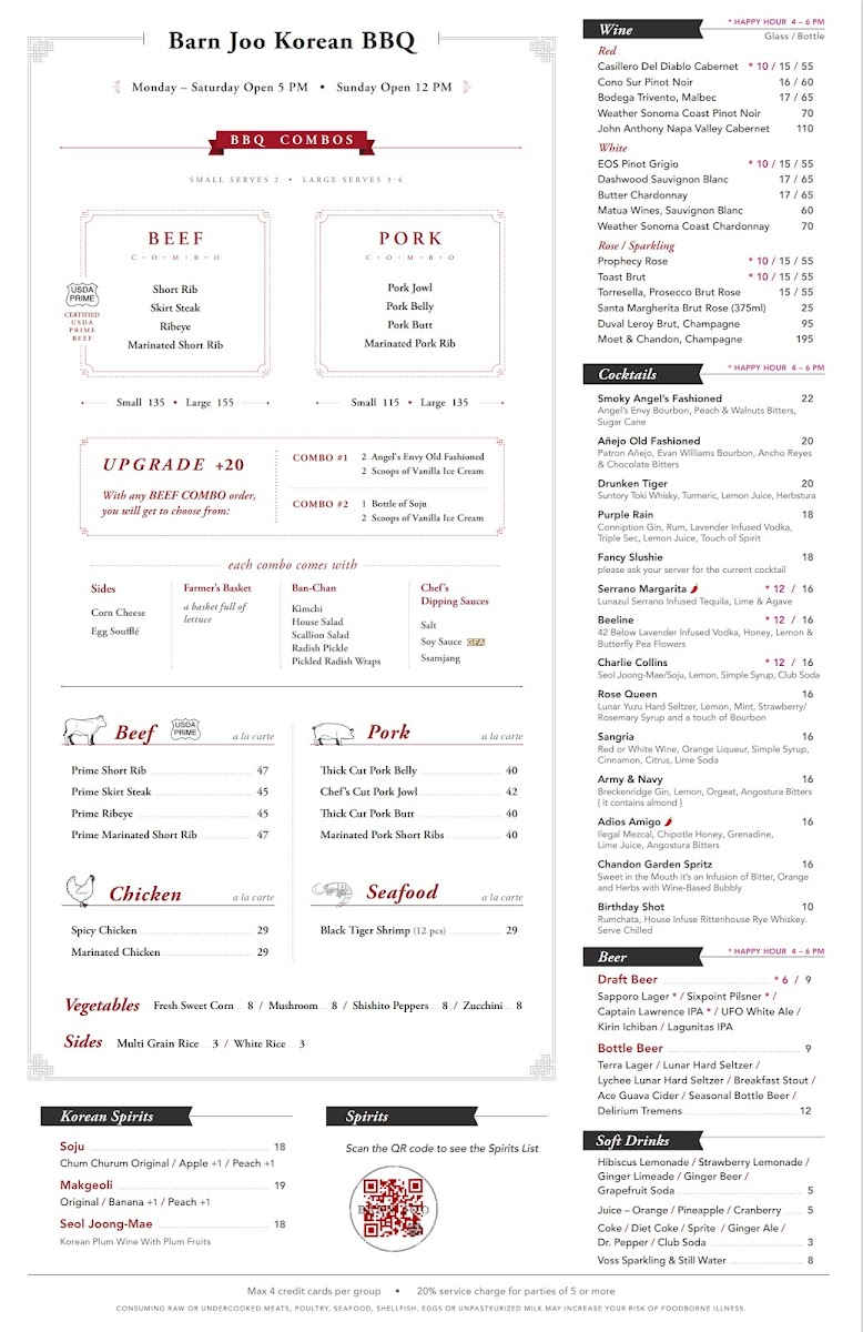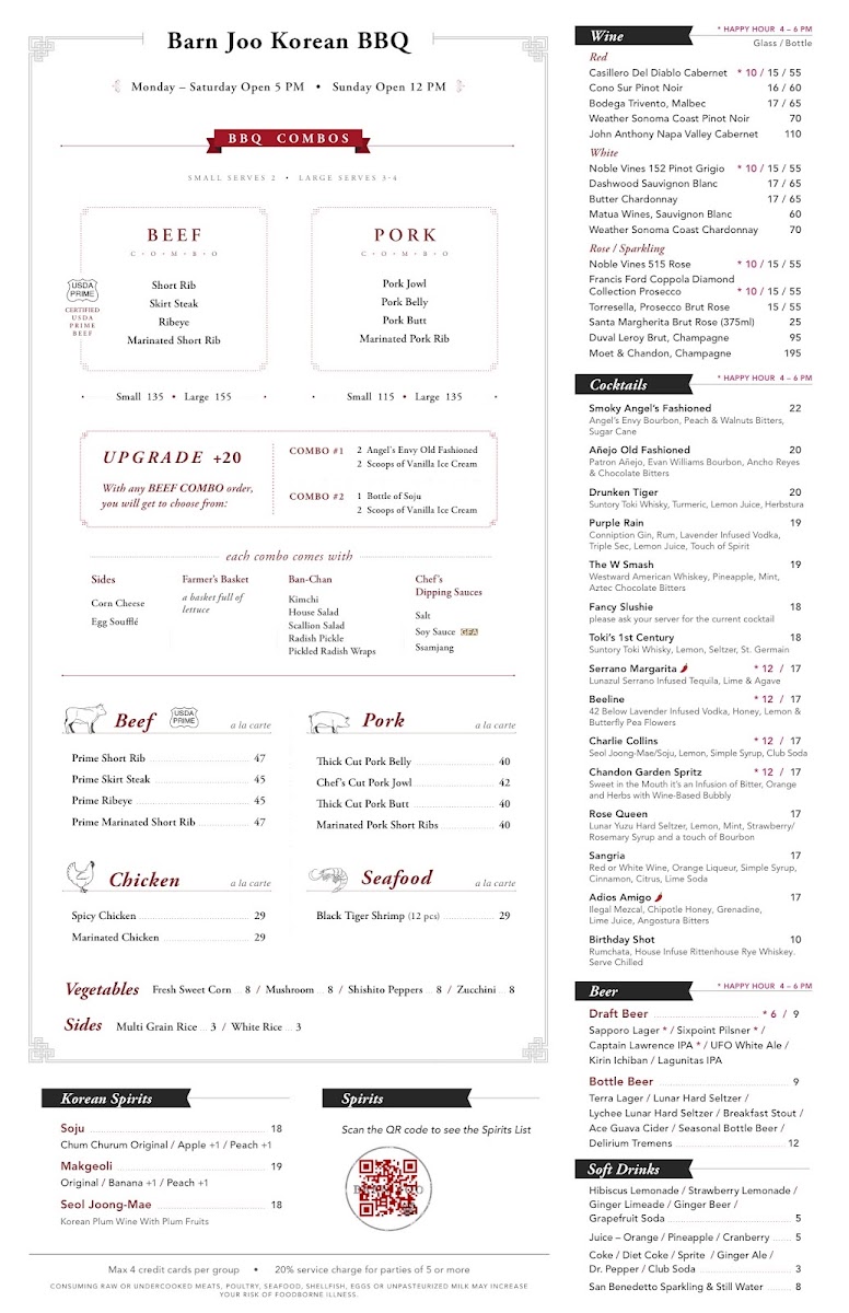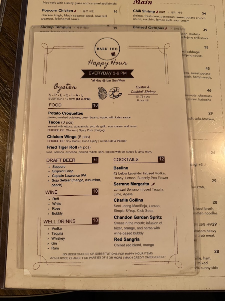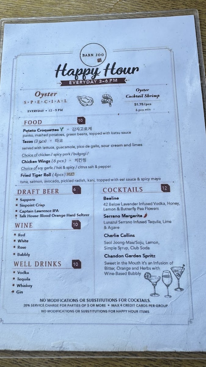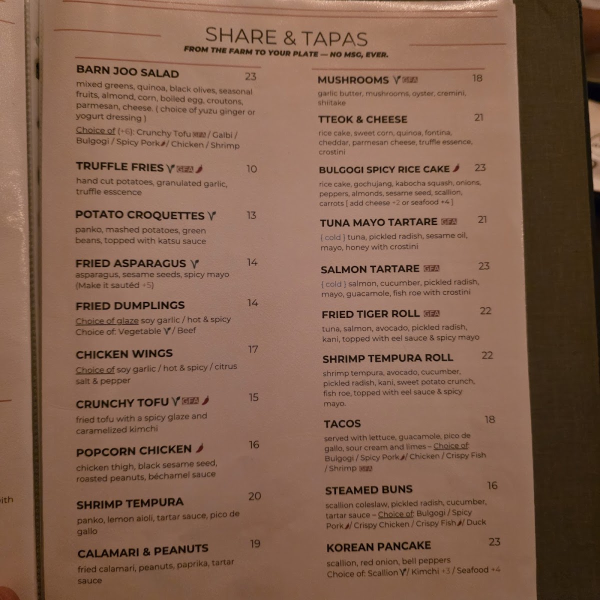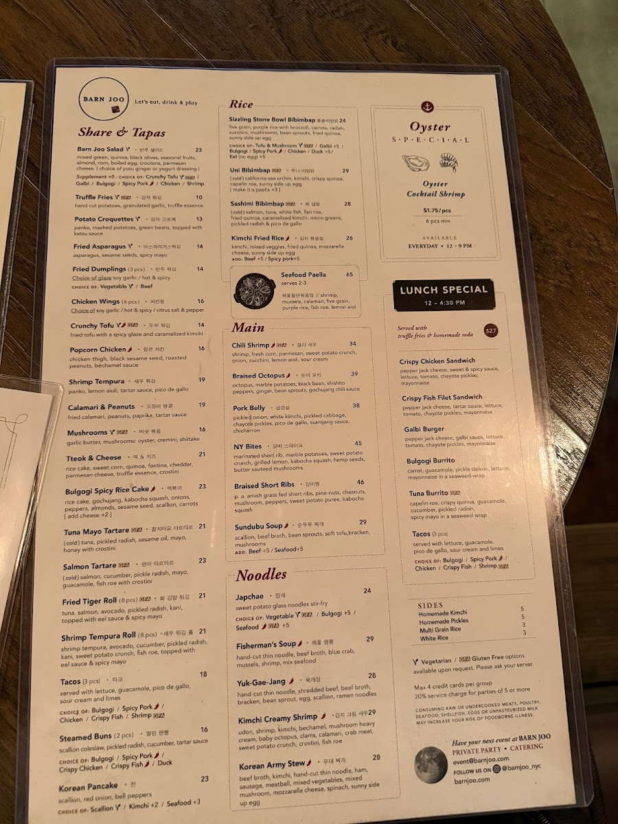 The menu at Barn Joo Union Square offers a thoughtful blend of traditional Korean flavors and contemporary twists, featuring a variety of dishes that are both comforting and vibrant. Whether you're stopping by for a casual lunch, gathering with friends for a lively dinner, or enjoying drinks in a relaxed bar setting, the selection caters to many occasions.