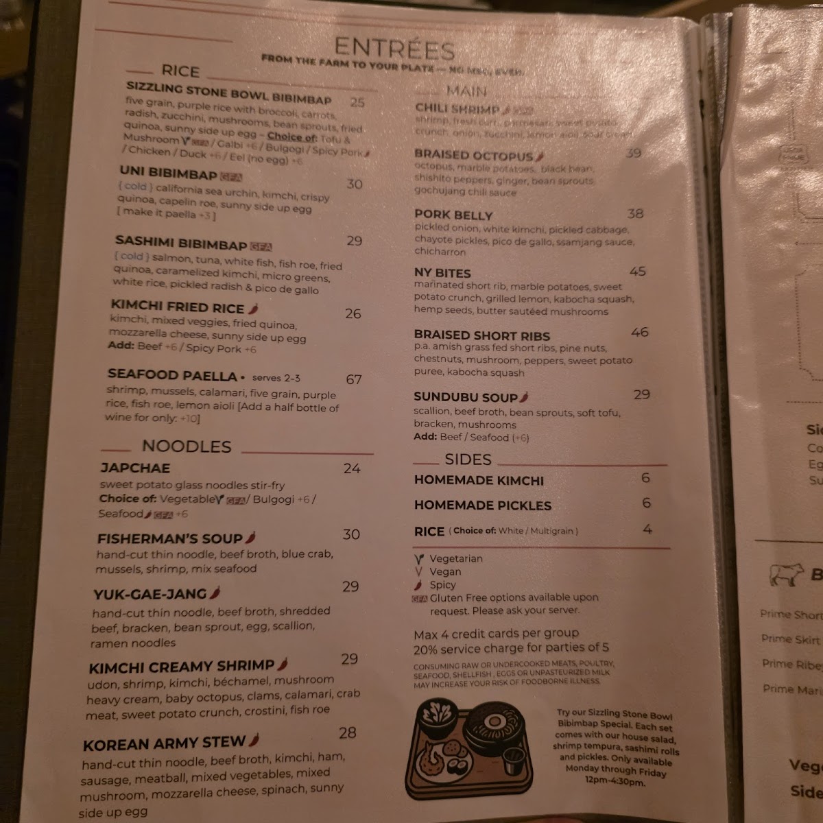 You'll find standout items like sizzling stonebowl bibimbap, fresh oysters with mignonette, crispy fried garlic chicken wings, and innovative plates such as bulgogi beef tacos and seafood paella. The menu also includes satisfying noodle soups, hearty short ribs, and a range of small and shareable dishes that complement the inviting atmosphere.